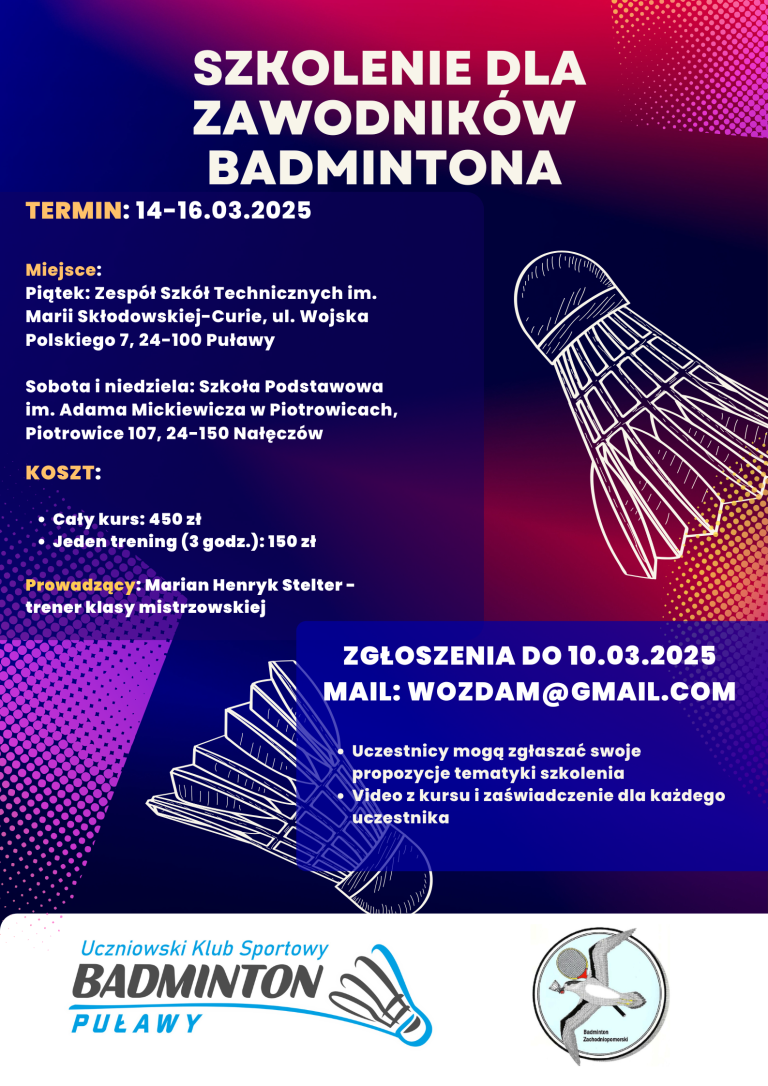 Zapraszamy wszystkich pasjonatów badmintona na intensywne szkolenie, które odbędzie się w dniach 14-16 marca 2025 r. w Puławach i…